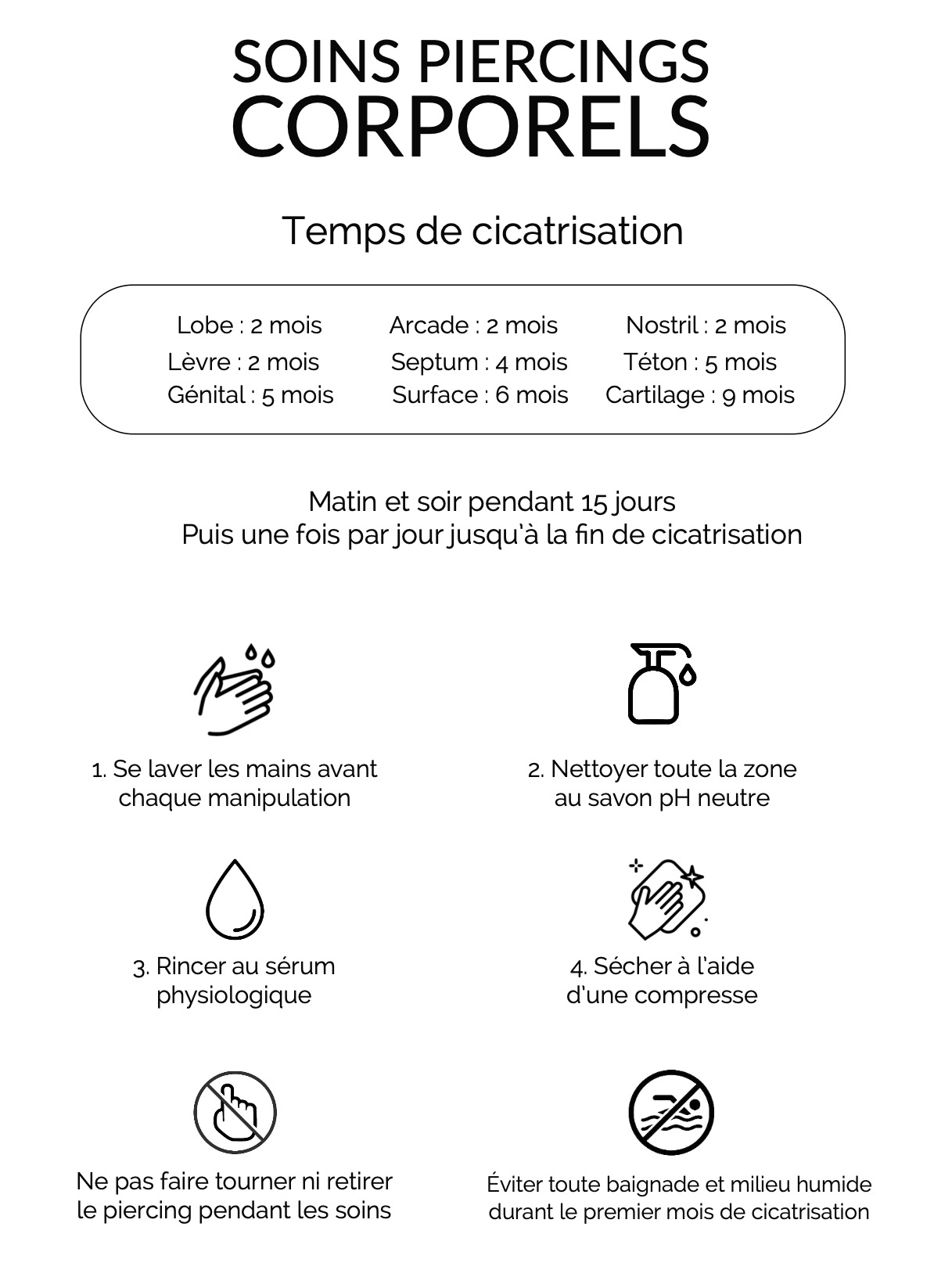 NB : L’antiseptique utilisé ainsi que la durée de l’application varient suivant le zone percée et des conseil spécifiques vus seront donnés immédiatement après la réalisation de votre piercing.