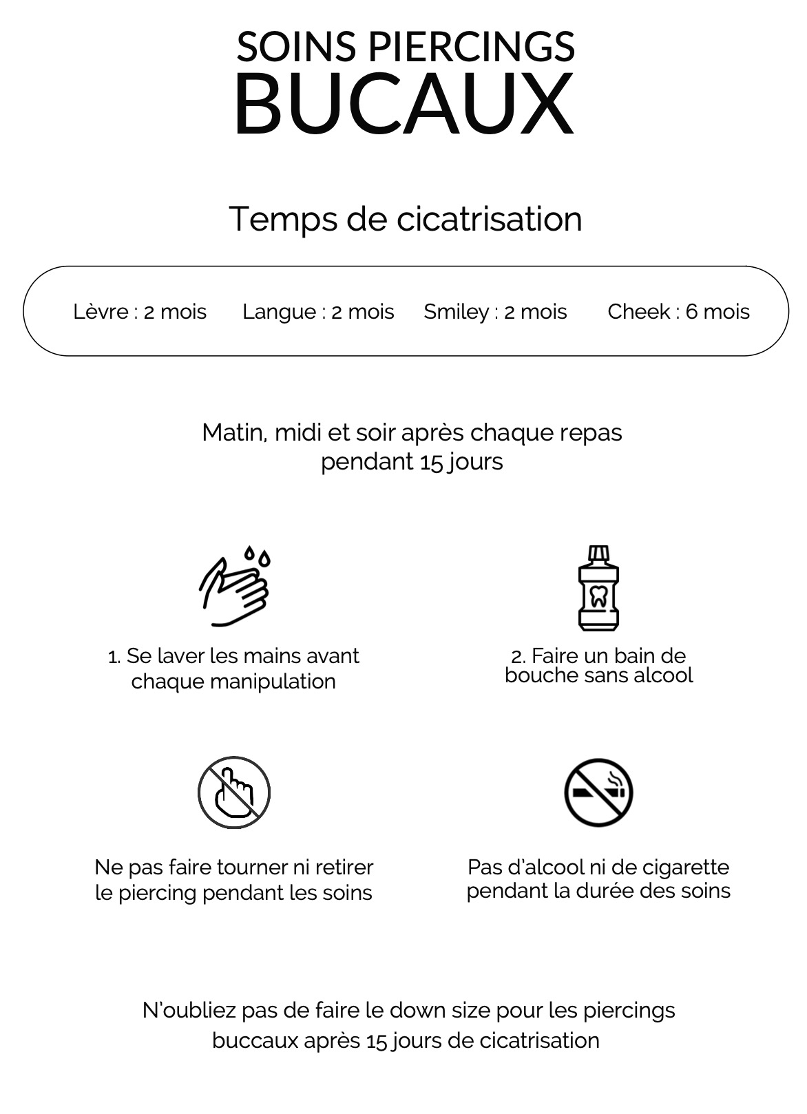 Pour les lèvres ou les joues, l’application d’un antiseptique est recommandée sur la face externe du piercing, en complément des bains de bouche, pour une durée de 10 jours maximum.